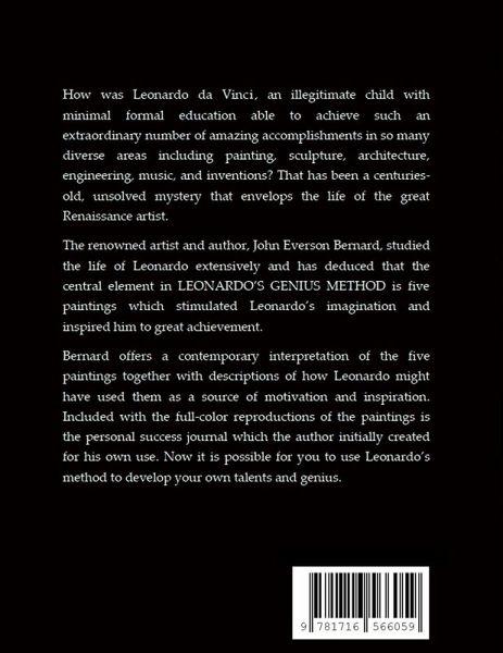 This book answers the centuries-old question: what was Leonardo da Vinci's source of inspiration which led him to achieve so many amazing, genius-level accomplishments in such diverse areas as painting, sculpture, architecture, engineering, music, science, and inventing? The renowned artist and author, John Everson Bernard, studied the life of Leonardo extensively and has deduced that the central element in LEONARDO'S GENIUS METHOD is five paintings which stimulated Leonardo's imagination and inspired him to great achievement. Bernard offers a contemporary interpretation of the five paintings together with descriptions of how Leonardo might have used them. Included with the full-color reproductions of the paintings is the personal success journal which the author initially created for his own use. Now it is possible for you to use LEONARDO'S METHOD yourself to develop your own unique talents and genius.