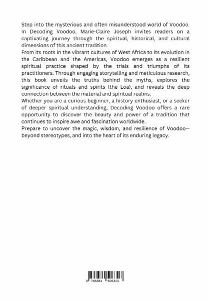 Step into the mysterious and often misunderstood world of Voodoo. In Decoding Voodoo, Marie-Claire Joseph invites readers on a captivating journey through the spiritual, historical, and cultural dimensions of this ancient tradition.From its roots in the vibrant cultures of West Africa to its evolution in the Caribbean and the Americas, Voodoo emerges as a resilient spiritual practice shaped by the trials and triumphs of its practitioners. Through engaging storytelling and meticulous research, this book unveils the truths behind the myths, explores the significance of rituals and spirits (the Loa), and reveals the deep connection between the material and spiritual realms.Whether you are a curious beginner, a history enthusiast, or a seeker of deeper spiritual understanding, Decoding Voodoo offers a rare opportunity to discover the beauty and power of a tradition that continues to inspire awe and fascination worldwide.Prepare to uncover the magic, wisdom, and resilience of Voodoo-beyond stereotypes, and into the heart of its enduring legacy.