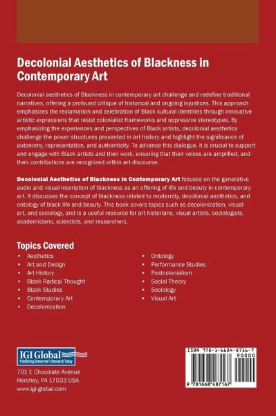 Decolonial aesthetics of Blackness in contemporary art challenge and redefine traditional narratives, offering a profound critique of historical and ongoing injustices. This approach emphasizes the reclamation and celebration of Black cultural identities through innovative artistic expressions that resist colonialist frameworks and oppressive stereotypes. By emphasizing the experiences and perspectives of Black artists, decolonial aesthetics challenge the power structures presented in art history and highlight the significance of autonomy, representation, and authenticity. To advance this dialogue, it is crucial to support and engage with Black artists and their work, ensuring that their voices are amplified, and their contributions are recognized within art discourse. Decolonial Aesthetics of Blackness in Contemporary Art focuses on the generative audio and visual inscription of blackness as an offering of life and beauty in contemporary art. It discusses the concept of blackness related to modernity, decolonial aesthetics, and ontology of black life and beauty. This book covers topics such as decolonization, visual art, and sociology, and is a useful resource for art historians, visual artists, sociologists, academicians, scientists, and researchers.