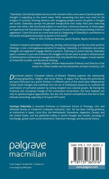 Decolonial Judaism: Triumphal Failures of Barbaric Thinking explores the relationship among geopolitics, religion, and social theory. It argues that during the postcolonial and post-Holocaust era, Jewish thinkers in different parts of the world were influenced by Global South thought and mobilized this rich set of intellectual resources to confront the assimilation of normative Judaism by various incipient neo-colonial powers. By tracing the historical and conceptual lineage of this overlooked conversation, this book explores not only its epistemological opportunities, but also the internal contradictions that led to its ultimate unraveling, especially in the post-9/11 world.