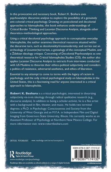 In this provocative and necessary book, Robert K. Beshara uses psychoanalytic discursive analysis to explore the possibility of a genuinely anti-colonial critical psychology. Drawing on postcolonial and decolonial approaches to Islamophobia, this book enhances understandings of Critical Border Thinking and Lacanian Discourse Analysis, alongside other theoretico-methodological approaches. Using a critical decolonial psychology approach to conceptualize everyday Islamophobia, the author examines theoretical resources situated within the discursive turn, such as decoloniality/transmodernity, and carries out an archeology of (counter)terrorism, a genealogy of the conceptual Muslim, and a ¿i¿ekian ideology critique. Conceiving of Decolonial Psychoanalysis as one theoretical resource for Critical Islamophobia Studies (CIS), the author also applies Lacanian Discourse Analysis to extracts from interviews conducted with US Muslims to theorize their ethico-political subjectivity and considers a politics of resistance, adversarial aesthetics, and ethics of liberation. Essential to any attempt to come to terms with the legacy of racism in psychology, and the only critical psychological study on Islamophobia in the United States, this is a fascinating read for anyone interested in a critical approach to Islamophobia.