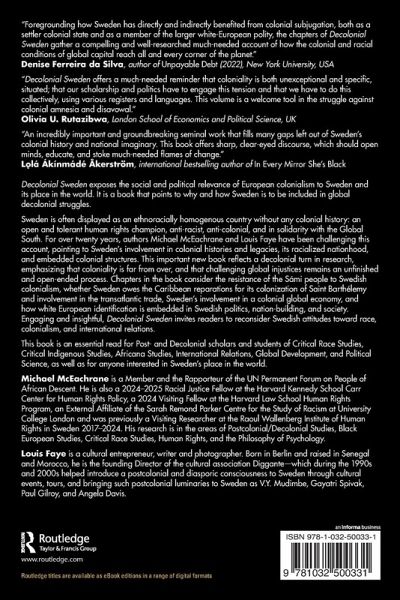 Sweden is often displayed as an ethnoracially homogenous country without any colonial history: an open and tolerant human rights champion, anti-racist, anti-colonial, and in solidarity with the Global South. For over twenty years, authors Michael McEachrane and Louis Faye have been challenging this account, pointing to Sweden's involvement in colonial histories and legacies, its racialized nationhood, and embedded colonial structures. This important new book reflects a decolonial turn in research, emphasizing that coloniality is far from over, and that challenging global injustices remains an unfinished and open-ended process. Chapters in the book consider the resistance of the Sámi people to Swedish colonialism, whether Sweden owes the Caribbean reparations for its colonization of Saint Barthélemy and involvement in the transatlantic trade, Sweden's involvement in a colonial global economy, and how white European identification is embedded in Swedish politics, nation-building, and society. Engaging and insightful, Decolonial Sweden invites readers to reconsider Swedish attitudes toward race, colonialism, and international relations.