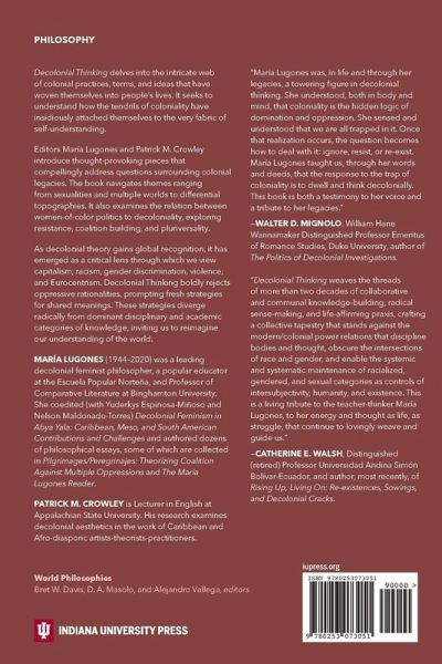 Decolonial Thinking delves into the intricate web of colonial practices, terms, and ideas that have woven themselves into people's lives. It seeks to understand how the tendrils of coloniality have insidiously attached themselves to the very fabric of self-understanding. From the mundane to the profound, this exploration sheds light on our relationship with all that constitutes life. Editors María Lugones and Patrick M. Crowley have meticulously curated 11 unique articles by interdisciplinary theorists. These thought-provoking pieces compellingly address questions surrounding colonial legacies. Organized into five sections, the book navigates themes ranging from sexualities and multiple worlds to differential topographies. It also examines the relation between women-of-color politics and decoloniality, exploring resistance, coalition building, and pluriversality. As decolonial theory gains global recognition, it has emerged as a critical lens through which we view capitalism, racism, gender discrimination, violence, and Eurocentrism. Decolonial Thinking boldly rejects oppressive rationalities, prompting fresh strategies for shared meanings. These strategies diverge radically from dominant disciplinary and academic categories of knowledge, inviting us to reimagine our understanding of the world.