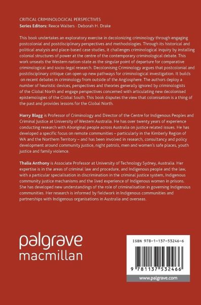 1. Introduction: Turning Criminology Upside Down.- 2. Postcolonial Criminology: 'The Past Isn't Over...'.- 3. 'Who Speaks for Place?'.- 4. Decolonising Criminology Methodologies.- 5. Borders Are Strange Places: From Borders of the State to Boundaries of the Prison.- 6. Restorative Justice or Indigenous Justice?.- 7. Disciplinary Power or Colonial Power?.-8. Justice in the Shadow of the Camp.- 9. Carceral Feminism: Saving Indigenous women from Indigenous men.- 10. Hybrid Justice i: Indigenous Sentencing and Justice Planning.- 11. Hybrid Justice ii: Night Patrols and Place Based Sovereignty.- 12. Conclusions: State of Exception and Bare Life in Criminology and Criminal "Justice".