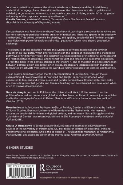 List of contributors; Acknowledgments; Introduction: decolonization and feminisms in global teaching and learning - a radical space of possibility, Rosalba Icaza and Sara de Jong; PART I Knowledge; Chapter 1 CarteArte: below and on the left in purple, Batallones Femeninos; Chapter 2 Pacific peoples, higher education and feminisms, Sereana Naepi; Chapter 3 Feminizing and decolonizing higher education: pedagogies of dignity in Colombia and Australia, Sara C. Motta; Chapter 4 Undoing colonial patriarchies: life and struggle pathway,s Xochitl Leyva Solano; Chapter 5 About the Transnational Network Other Knowledges: La Red Trasnacional Otros Saberes (RETOS) between crises and other possible worlds, Red Trasnacional Otros Saberes; PART II Voice; Chapter 6 The decolonization manifesto, Wanelisa Xaba; Chapter 7 The liability of foreignness: decolonial struggles of migrants negotiating African identity within UK nurse education, Roselyn Masamha; Chapter 8 Decolonial feminist teaching and learning: what is the space of decolonial feminist teaching? Françoise Vergès; Chapter 9 ATELIER IV Manifesto, Françoise Vergès et al.; PART III Institutions; Chapter 10 What a new university in Africa is doing to decolonize social sciences, Jess Auerbach; Chapter 11 Coloniality of power, knowledge and modes of (des)authorization: occupation practices in Brazilian schools and universities, Marta Fernández and Andréa Gill; Chapter 12 Learning from prisons: decolonial feminism and teaching approaches from prison to university, Elena Vasiliou; Chapter 13 Post-it notes to my lecturers, Roselyn Masamha; PART IV Disciplines; Chapter 14 Intervention, Sixteen participants of the "Crossing Borders" conference in Lesbos, Greece, July 2016; Chapter 15 On babies and bathwater: decolonizing International Development Studies, Olivia U. Rutazibwa; Chapter 16 "Straight from the heart": a pedagogy for the vanquished of history, Asha Varadharajan; Chapter 17 Notes on Europe and Europeans for the discerning traveller, Robbie Shilliam; Index