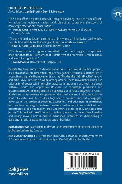 Chapter 1. Re-Storying African (Studies) Pedagogies: Decolonizing Knowledge and Centering Black Agency?.- Chapter 2. Beyond Reaction: (Re)-Imagining African agency in the decolonization of knowledge.- Chapter 3. Africa, Knowledge Production and Scholarly Prestige.- Chapter 4. RepresentationMatters: Unpacking the Prevalence of Whiteness in the Teaching of African Studies Abroad.- Chapter 5. Constructing Knowledge about Africa in a South African University Classroom: Living Creatively with the Colonial Library.- Chapter 6. 'Dem European teachings in my African school': Unpacking coloniality and Eurocentric hegemony in African education through Burna Boy's Monsters You Made.- Chapter 7. Is Sub-Saharan Africa a knowledge society or economy?.- Chapter 8. The Perceived Universality of the West and the Silencing of 'Africa' in Western Syllabi of International Relations.- Chapter 9. The Façade of 'Transforming' Post-Apartheid Universities in South Africa: Towards African-Centred Practices and Processes of Redress. Chapter 10. Agency, Africanity, and Some Propositions for Engaged Scholarship.