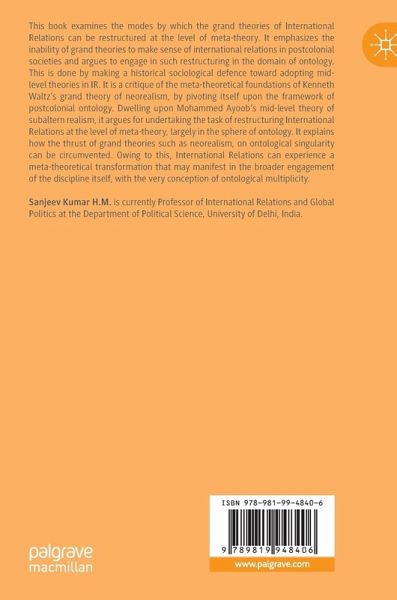 This book examines the modes by which the grand theories of International Relations can be restructured at the level of meta-theory. It emphasizes the inability of grand theories to make sense of international relations in postcolonial societies and argues to engage in such restructuring in the domain of ontology. This is done by making a historical sociological defence toward adopting mid-level theories in IR. It is a critique of the meta-theoretical foundations of Kenneth Waltz's grand theory of neorealism, by pivoting itself upon the framework of postcolonial ontology. Dwelling upon Mohammed Ayoob's mid-level theory of subaltern realism, it argues for undertaking the task of restructuring International Relations at the level of meta-theory, largely in the sphere of ontology. It explains how the thrust of grand theories such as neorealism, on ontological singularity can be circumvented. Owing to this, International Relations can experience a meta-theoretical transformationthat may manifest in the broader engagement of the discipline itself, with the very conception of ontological multiplicity.
