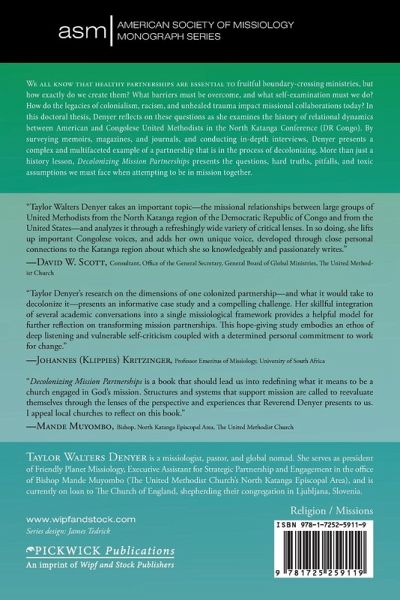 We all know that healthy partnerships are essential to fruitful boundary-crossing ministries, but how exactly do we create them? What barriers must be overcome, and what self-examination must we do? How do the legacies of colonialism, racism, and unhealed trauma impact missional collaborations today? In this doctoral thesis, Denyer reflects on these questions as she examines the history of relational dynamics between American and Congolese United Methodists in the North Katanga Conference (DR Congo). By surveying memoirs, magazines, and journals, and conducting in-depth interviews, Denyer presents a complex and multifaceted example of a partnership that is in the process of decolonizing. More than just a history lesson, Decolonizing Mission Partnerships presents the questions, hard truths, pitfalls, and toxic assumptions we must face when attempting to be in mission together.