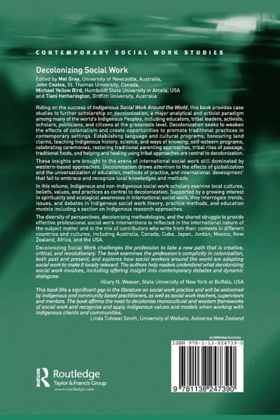 Riding on the success of Indigenous Social Work Around the World, this book provides case studies to further scholarship on decolonization, a major analytical and activist paradigm among many of the world's Indigenous Peoples, including educators, tribal leaders, activists, scholars, politicians, and citizens at the grassroots level. Decolonization seeks to weaken the effects of colonialism and create opportunities to promote traditional practices in contemporary settings. Establishing language and cultural programs; honouring land claims, teaching Indigenous history, science, and ways of knowing; self-esteem programs, celebrating ceremonies, restoring traditional parenting approaches, tribal rites of passage, traditional foods, and helping and healing using tribal approaches are central to decolonization. These insights are brought to the arena of international social work still dominated by western-based approaches. Decolonization draws attention to the effects of globalization and the universalization of education, methods of practice, and international 'development' that fail to embrace and recognize local knowledges and methods. In this volume, Indigenous and non-Indigenous social work scholars examine local cultures, beliefs, values, and practices as central to decolonization. Supported by a growing interest in spirituality and ecological awareness in international social work, they interrogate trends, issues, and debates in Indigenous social work theory, practice methods, and education models including a section on Indigenous research approaches. The diversity of perspectives, decolonizing methodologies, and the shared struggle to provide effective professional social work interventions is reflected in the international nature of the subject matter and in the mix of contributors who write from their contexts in different countries and cultures, including Australia, Canada, Cuba, Japan, Jordan, Mexico, New Zealand, South Africa, and the USA.