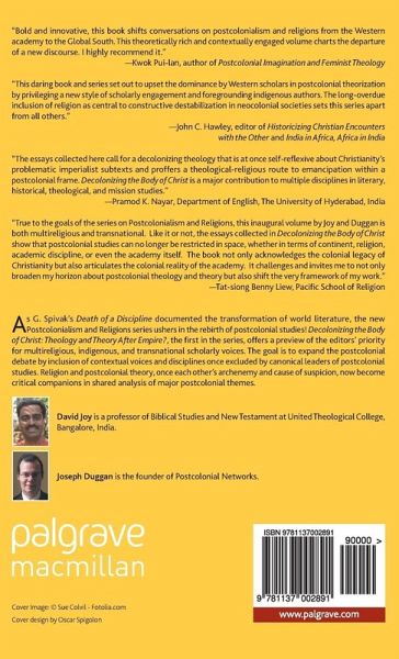 "True to the goals of the series on Postcolonialism and Religion, this inaugural volume by Joy and Duggan is both multireligious and transnational. Like it or not, the essays collected in Decolonizing the Body of Christ show that postcolonial studies can no longer be restricted in space, whether in terms of continent, religion, academic discipline, or even the academy itself. The book not only acknowledges the colonial legacy of Christianity but also articulates the colonial reality of the academy. It challenges and invites me to not only broaden my horizon about postcolonial theology and theory but also shift the very framework of my work." - Tat-siong Benny Liew, Pacific School of Religion, USA