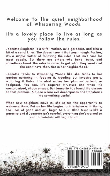 Welcome to the quiet neighborhood of Whispering Woods. It's a lovely place to live...as long as you follow the rules. Jeanette Singleton is a wife, mother, avid gardener, and also a bit of a serial killer. She doesn't see it that way, though. For her, it's a simple matter of following the rules. That isn't hard for most people. But there are others who bend, twist, and sometimes break the rules in order to get what they want and she can't have that. Not in her neighborhood. Jeanette tends to Whispering Woods like she tends to her garden-nurturing it, feeding it, weeding out invasive pests, watching it thrive. It's what makes her plan so perfect, so foolproof. You see, life requires structure and when it's compromised, chaos ensues. But Jeanette has found the answer to that problem. A place where evil decomposes and transforms into something useful. When new neighbors move in, she seizes the opportunity to welcome them. But as her life begins to intertwine with theirs, the lines of good and evil begin to blur. Blind trust is like a parasite and if Jeanette isn't careful, everything she's worked so hard to maintain will begin to rot.