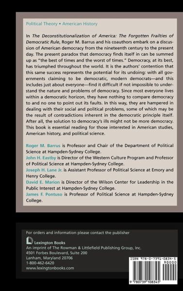 In The Deconstitutionalization of America: The Forgotten Frailties of Democratic Rule, Roger M. Barrus and his coauthors embark on a discussion of American democracy from the nineteenth century to the present day. The present paradox democracy finds itself in can be summed up as "the best of times and the worst of times." Democracy, at its best, has triumphed throughout the world. It is the authors contention that this same success represents the potential for its undoing: with all governments claiming to be democratic, modern democrats-and this includes just about everyone-find it difficult if not impossible to understand the nature and problems of democracy. Since most everyone lives within a democratic horizon, they have nothing to compare democracy to and no one to point out its faults. In this way, they are hampered in dealing with their social and political problems, some of which may be the result of contradictions inherent in the democratic principle itself. The solution to democracy's ills might not be, after all, more democracy.