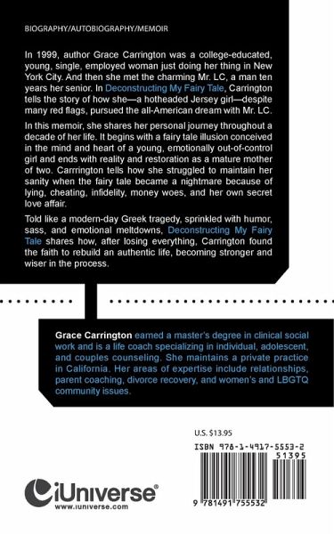 In 1999, author Grace Carrington was a college-educated, young, single, employed woman just doing her thing in New York City. And then she met the charming Mr. LC, a man ten years her senior. In Deconstructing My Fairy Tale, Carrington tells the story of how she-a hotheaded Jersey girl-despite many red flags, pursued the all-American dream with Mr. LC. In this memoir, she shares her personal journey throughout a decade of her life. It begins with a fairy tale illusion conceived in the mind and heart of a young, emotionally out-of-control girl and ends with reality and restoration as a mature mother of two. Carrrington tells how she struggled to maintain her sanity when the fairy tale became a nightmare because of lying, cheating, infidelity, money woes, and her own secret love affair. Told like a modern-day Greek tragedy, sprinkled with humor, sass, and emotional meltdowns, Deconstructing My Fairy Tale shares how, after losing everything, Carrington found the faith to rebuild an authentic life, becoming stronger and wiser in the process.
