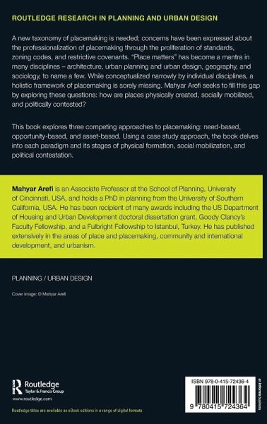 A new taxonomy of placemaking is needed; concerns have been expressed about the professionalization of placemaking through the proliferation of standards, zoning codes, and restrictive covenants. "Place matters" has become a mantra in many disciplines - architecture, urban planning and urban design, geography, and sociology to name a few. While conceptualized narrowly by individual disciplines, a holistic framework of placemaking is sorely missing. Mahyar Arefi seeks to fill this gap by exploring these questions: how are places physically created, socially mobilized, and politically contested? This book explores three competing approaches to placemaking: need-based, opportunity-based, and asset-based. Using a case study approach, the book delves into each paradigm and its stages of physical formation, social mobilization, and political contestation.