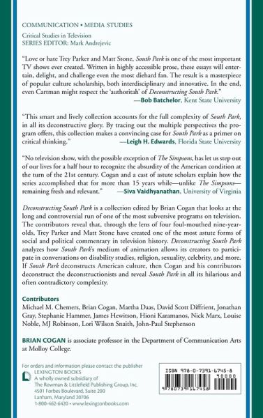 Deconstructing South Park: Critical Examinations of Animated Transgression is the first book to systematically analyze the cultural phenomenon of South Park from a wide scope of theoretical approaches. Brian Cogan and the other contributors address the show from perspectives as diverse as media studies, disability studies, and literary theory to ideological analysis, deviancy studies and media studies. Deconstructing South Park represents an essential contribution to television/media studies for both academics and popular audiences alike.