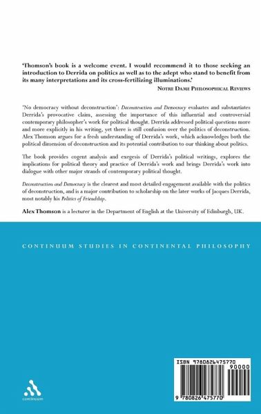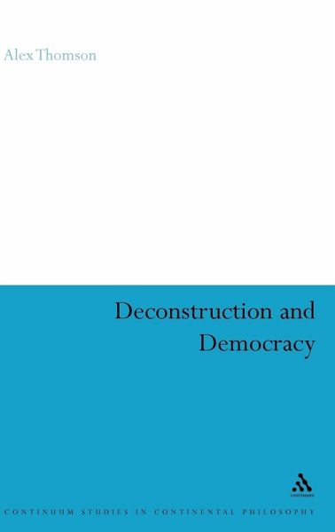 'No democracy without deconstruction': Deconstruction and Democracy evaluates and substantiates Derrida's provocative claim, assessing the importance of this influential and controversial contemporary philosopher's work for political thought. Derrida addressed political questions more and more explicitly in his writing, yet there is still confusion over the politics of deconstruction. Alex Thomson argues for a fresh understanding of Derrida's work, which acknowledges both the political dimension of deconstruction and its potential contribution to our thinking about politics. The book provides cogent analysis and exegesis of Derrida's political writings; explores the implications for political theory and practice of Derrida's work; and brings Derrida's work into dialogue with other major strands of contemporary political thought. Deconstruction and Democracy is the clearest and most detailed engagement available with the politics of deconstruction, and is a major contribution to scholarship on the later works of Jacques Derrida, most notably his Politics of Friendship .