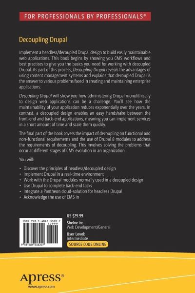 Implement a headless/decoupled Drupal design to build easily maintainable web applications. This book begins by showing you CMS workflows and best practices to give you the basics you need for working with decoupled Drupal. As part of this process, Decoupling Drupal reveals the advantages of using content management systems and explains that decoupled Drupal is the answer to various problems faced in creating and maintaining enterprise applications.