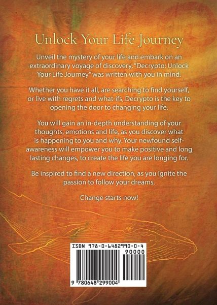 Colour Edition Readers' Favorite - International 'Bronze' Award Winner International Book Excellence Award Winner in Body/Mind/Spirit Genre Literary Titan 'Gold' Book Award Winner 2020 TopShelf Book Award: Nominee. ¿¿¿¿¿Decrypto Unlock Your Life Journey: Your Key To The Mystery Of Boundless Happiness: A Step By Step Inspirational Guide DECRYPTO is about self-empowerment - the sharing of knowledge is the key that opens the door to a new beginning. The Realization, that you have the potential to change your life, to find yourself and to live a dream....... Back of Book Blurb: Unveil the mystery of your life and embark on an extraordinary voyage of discovery. "Decrypto: Unlock Your Life Journey" was written with you in mind. Whether you have it all, are searching to find yourself, or live with regrets and what-ifs, Decrypto is the key to opening the door to changing your life. You will gain an in-depth understanding of your thoughts, emotions and life, as you discover what is happening to you and why. Your newfound self-awareness will empower you to make positive and long-lasting changes, to create the life you are longing for. Be inspired to find a new direction, as you ignite the passion to follow your dreams. Change starts now! (Beautifully presented in colour, Decrypto includes affirmations, reflections, quotes, dream catcher, suggestions and much more.)¿¿¿¿¿¿¿ Literary Titan Review: "This book is empowering and strong. It is powerful and aggressively true!" Promo video of the book: https://vimeo.com/265328976