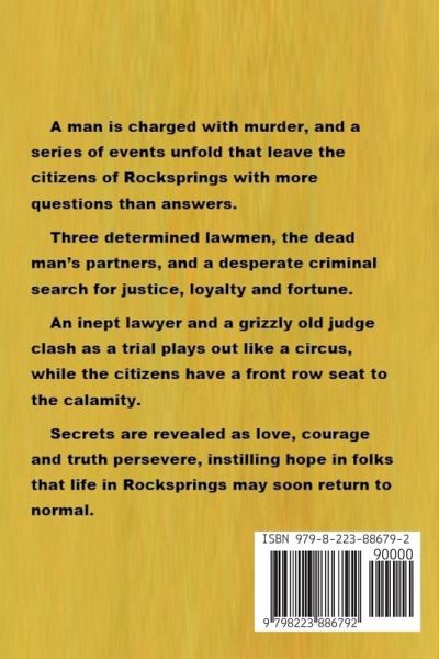 A man is charged with murder, and a series of events unfold that leave the citizens of Rocksprings with more questions than answers. Three determined lawmen, the dead man's partners, and a desperate criminal search for justice, loyalty and fortune. An inept lawyer and a grizzly old judge clash as a trial plays out like a circus, while the citizens have a front row seat to the calamity. Secrets are revealed as love, courage and truth persevere, instilling hope in folks that life in Rocksprings may soon return to normal.
