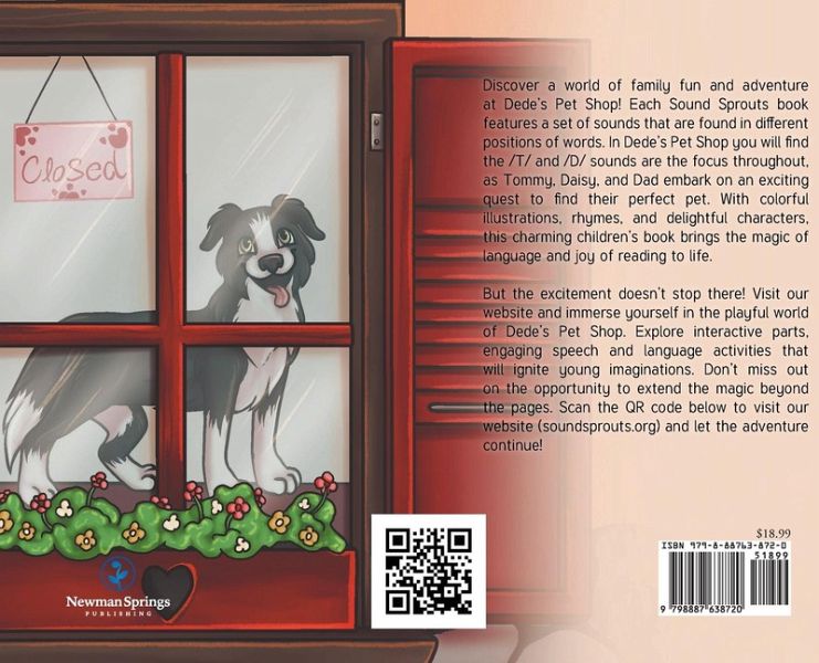 Discover a world of family fun and adventure at Dede's Pet Shop! Each Sound Sprouts book features a set of sounds that are found in different positions of words. In Dede's Pet Shop you will find the /T/ and /D/ sounds are the focus throughout, as Tommy, Daisy, and Dad embark on an exciting quest to find their perfect pet. With colorful illustrations, rhymes, and delightful characters, this charming children's book brings the magic of language and joy of reading to life. But the excitement doesn't stop there! Visit our website and immerse yourself in the playful world of Dede's Pet Shop. Explore interactive parts, engaging speech and language activities that will ignite young imaginations. Don't miss out on the opportunity to extend the magic beyond the pages. Scan the QR code below to visit our website (soundsprouts.org) and let the adventure continue!