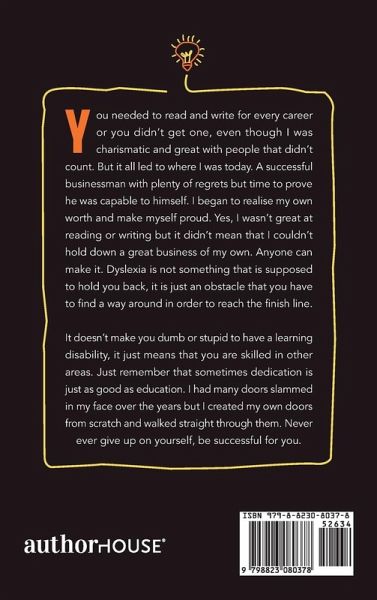 You needed to read and write for every career or you didn't get one, even though I was charismatic and great with people that didn't count. But it all led to where I was today. A successful businessman with plenty of regrets but time to prove he was capable to himself. I began to realise my own worth and make myself proud. Yes, I wasn't great at reading or writing but it didn't mean that I couldn't hold down a great business of my own. Anyone can make it. Dyslexia is not something that is supposed to hold you back, it is just an obstacle that you have to find a way around in order to reach the finish line. It doesn't make you dumb or stupid to have a learning disability, it just means that you are skilled in other areas. Just remember that sometimes dedication is just as good as education. I had many doors slammed in my face over the years but I created my own doors from scratch and walked straight through them. Never ever give up on yourself, be successful for you.