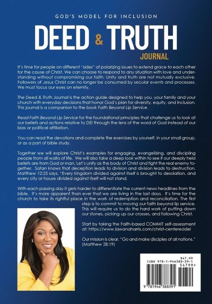 It's time for people on different "sides" of polarizing issues to extend grace to each other for the cause of Christ. We can choose to respond to any situation with love and understanding without compromising our faith. Unity and truth are not mutually exclusive. Followers of Jesus Christ can no longer be consumed by secular events and processes. We must focus our eyes on eternity. The Deed & Truth Journal is the action guide designed to help you, your family and your church with everyday decisions that honor God's plan for diversity, equity, and inclusion. This journal is a companion to the book Faith Beyond Lip Service. Read Faith Beyond Lip Service for the foundational principles that challenge us to look at our beliefs and actions relative to DEI through the lens of the word of God instead of our bias or political affiliation. You can read the devotions and complete the exercises by yourself, in your small group, or as a part of bible study. Together we will explore Christ's examples for engaging, evangelizing, and discipling people from all walks of life. We will also take a deep look within to see if our deeply held beliefs are from God or man. Let's unify as the body of Christ and fight the real enemy together. Satan knows that deception leads to division and division leads to destruction. Matthew 12:25 says, "Every kingdom divided against itself is brought to desolation, and every city or house divided against itself will not stand. With each passing day it gets harder to differentiate the current news headlines from the bible. It's more apparent than ever that we are living in the last days. It's time for the church to take its rightful place in the work of redemption and reconciliation. The first step is to commit to moving our faith beyond lip service. This will require us to do the hard work of putting down our stones, picking up our crosses, and following Christ. Start by taking the Faith-based COMMIT self-assessment at: https://www.lawanaharris.com/christ-centereddei Our mission is clear. "Go and make disciples of all nations." (Matthew 28:19)