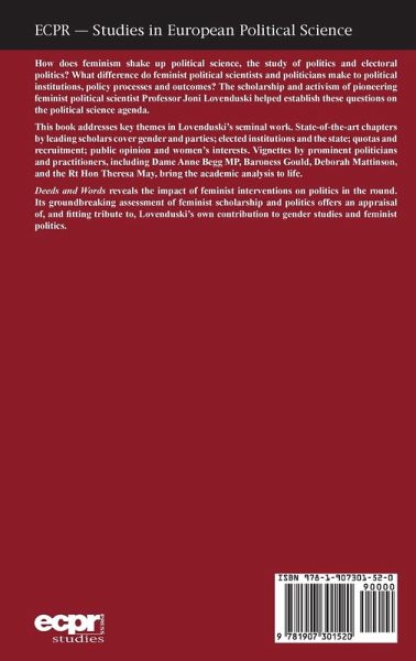 How does feminism shake up political science, the study of politics and electoral politics? What difference do feminist political scientists and politicians make to political institutions, policy processes and outcomes? The scholarship and activism of pioneering feminist political scientist Professor Joni Lovenduski helped establish these questions on the political science agenda. This book addresses key themes in Lovenduski's seminal work. State-of-the-art chapters by leading scholars cover gender and parties; elected institutions and the state; quotas and recruitment; public opinion and women's interests. Vignettes by prominent politicians and practitioners, including Dame Anne Begg MP, Baroness Gould, Deborah Mattinson, and the Rt Hon Theresa May, bring the academic analysis to life. Deeds and Words reveals the impact of feminist interventions on politics in the round. Its groundbreaking assessment of feminist scholarship and politics offers an appraisal of, and fitting tribute to, Lovenduski's own contribution to gender studies and feminist politics.