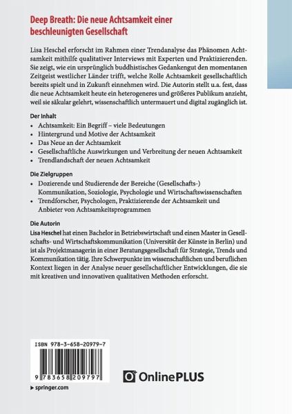 Lisa Heschel erforscht im Rahmen einer Trendanalyse das Phänomen Achtsamkeit mithilfe qualitativer Interviews mit Experten und Praktizierenden. Sie zeigt, wie ein ursprünglich buddhistisches Gedankengut den momentanen Zeitgeist westlicher Länder trifft, welche Rolle Achtsamkeit gesellschaftlich bereits spielt und in Zukunft einnehmen wird. Die Autorin stellt u.a. fest, dass die neue Achtsamkeit heute ein heterogeneres und größeres Publikum anzieht, weil sie säkular gelehrt, wissenschaftlich untermauert und digital zugänglich ist.