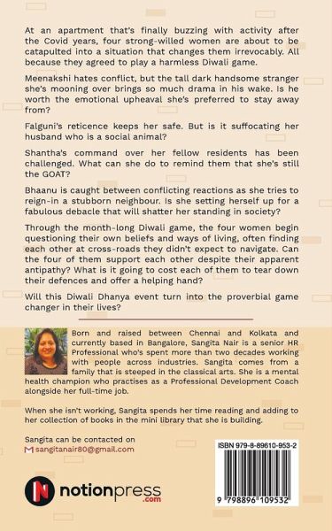 At an apartment that's finally buzzing with activity after the Covid years, four strong-willed women are about to be catapulted into a situation that changes them irrevocably. All because they agreed to play a harmless Diwali game. Meenakshi hates conflict, but the tall dark handsome stranger she's mooning over brings so much drama in his wake. Is he worth the emotional upheaval she's preferred to stay away from? Falguni's reticence keeps her safe. But is it suffocating her husband who is a social animal? Shantha's command over her fellow residents has been challenged. What can she do to remind them that she's still the GOAT? Bhaanu is caught between conflicting reactions as she tries to reign-in a stubborn neighbour. Is she setting herself up for a fabulous debacle that will shatter her standing in society? Through the month-long Diwali game, the four women begin questioning their own beliefs and ways of living, often finding each other at cross-roads they didn't expect to navigate. Can the four of them support each other despite their apparent antipathy? What is it going to cost each of them to tear down their defences and offer a helping hand? Will this Diwali Dhanya event turn into the proverbial game changer in their lives?