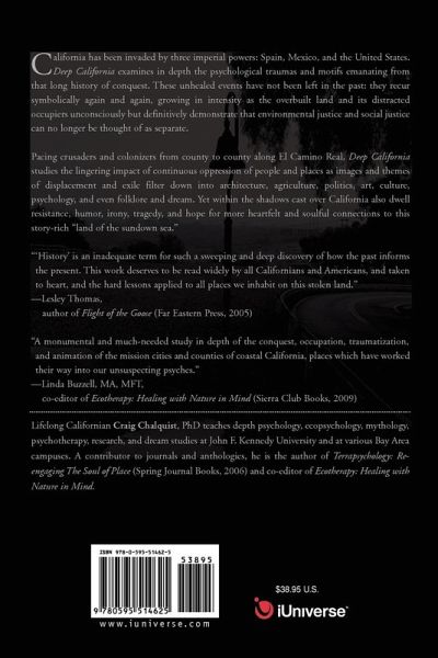 California has been invaded by three imperial powers: Spain, Mexico, and the United States. Deep California examines in depth the lingering psychological traumas and motifs emanating from that long history of conquest. These unhealed events have not been left in the past: they recur symbolically again and again, growing in intensity as the overbuilt land and its distracted occupiers unconsciously but definitively demonstrate that environmental justice and social justice can no longer be thought of as separate. Pacing crusaders and colonizers from county to county along El Camino Real, Deep California studies the lingering impact of continuous oppression of people and places as images and themes of displacement and exile filter down into architecture, agriculture, politics, art, culture, psychology, and even folklore and dream. Yet within the shadows cast over California also dwell resistance, humor, irony, tragedy, and hope for more heartfelt and soulful connections to this story-rich "land of the sundown sea." "History" is an inadequate term for such a sweeping and deep discovery of how the past informs the present. This work deserves to be read widely by all Californians and Americans, and taken to heart, and the hard lessons applied to all places we inhabit on this stolen land. -Lesley Thomas, author of Flight of the Goose (Far Eastern Press, 2005) "A monumental and much-needed study in depth of the conquest, occupation, traumatization, and animation of the mission cities and counties of coastal California, places which have worked their way into our unsuspecting psyches." -Linda Buzzell, MA, MFT, co-editor of Ecotherapy: Healing with Nature in Mind (Sierra Club Books, 2009)