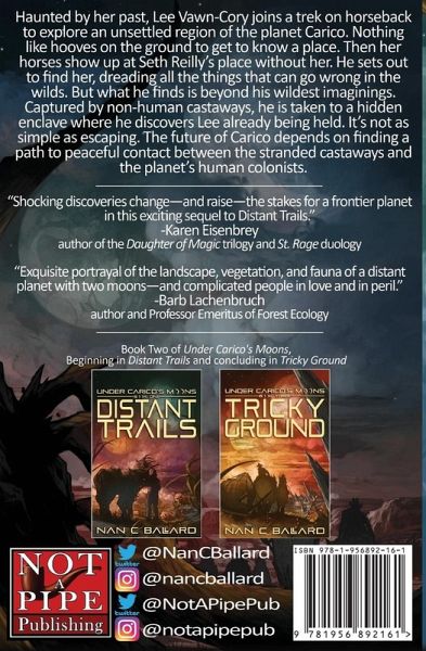 Haunted by her past, Lee Vawn-Cory joins a trek on horseback to explore an unsettled region of the planet Carico. Nothing like hooves on the ground to get to know a place. Then her horses show up at Seth Reilly's place without her. He sets out to find her, dreading all the things that can go wrong in the wilds. But what he finds is beyond his wildest imaginings. Captured by non-human castaways, he is taken to a hidden enclave where he discovers Lee already being held. It's not as simple as escaping. The future of Carico depends on finding a path to peaceful contact between the stranded castaways and the planet's human colonists.