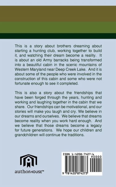 This is a story about brothers dreaming about starting a hunting club, working together to build it, and watching their dream become a reality. It is about an old Army barracks being transformed into a beautiful cabin in the scenic mountains of Western Maryland near Deep Creek Lake. And it is about some of the people who were involved in the construction of this cabin and some who were not fortunate enough to see it completed. This is also a story about the friendships that have been forged through the years, hunting and working and laughing together in the cabin that we share. Our friendships can be motivational, and our stories will make you laugh and cry. We believe in our dreams and ourselves. We believe that dreams become reality when you work hard enough. And we believe that those dreams become a legacy for future generations. We hope our children and grandchildren will continue the traditions.