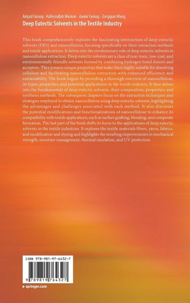 This book comprehensively explores the fascinating intersection of deep eutectic solvents (DES) and nanocellulose, focusing specifically on their extraction methods and textile applications. It delves into the revolutionary role of deep eutectic solvents in nanocellulose extraction. Deep eutectic solvents are a class of non-toxic, low-cost, and environmentally friendly solvents formed by combining hydrogen bond donors and acceptors. They possess unique properties that make them highly suitable for dissolving cellulose and facilitating nanocellulose extraction with enhanced efficiency and sustainability. The book begins by providing a thorough overview of nanocellulose, its types, properties, and potential applications in the textile industry. It then delves into the fundamentals of deep eutectic solvents, their composition, properties, and synthesis methods. The subsequent chapters focus on the extraction techniques and strategies employed to obtain nanocellulose using deep eutectic solvents, highlighting the advantages and challenges associated with each method. It also discusses the potential modifications and functionalizations of nanocellulose to enhance its compatibility with textile applications, such as surface grafting, blending, and composite formation. The last part of the book shifts its focus to the applications of deep eutectic solvents in the textile industries. It explores the textile materials fibers, yarns, fabrics, and modification and dyeing and highlights the resulting improvements in mechanical strength, moisture management, thermal insulation, and UV protection.