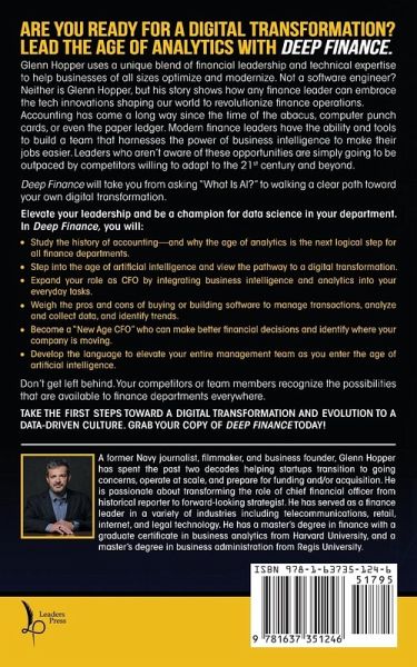 Deep Finance is informative, enlightening, and embraces the innovation all around us - perfect for trailblazing CFOs ready to dive deep into an era of information, analytics, and Big Data.ARE YOU READY FOR A DIGITAL TRANSFORMATION? LEAD THE AGE OF ANALYTICS WITH DEEP FINANCE.Glenn Hopper uses a unique blend of financial leadership and technical expertise to help businesses of all sizes optimize and modernize. Not a software engineer? Neither is Glenn Hopper, but his story shows how any finance leader can embrace the tech innovations shaping our world to revolutionize finance operations.Accounting has come a long way since the time of the abacus, computer punch cards, or even the paper ledger. Modern finance leaders have the ability and tools to build a team that harnesses the power of business intelligence to make their jobs easier. Leaders who aren't aware of these opportunities are simply going to be outpaced by competitors willing to adapt to the 21st century and beyond.Deep Finance will take you from asking "What Is AI?" to walking a clear path toward your own digital transformation.Elevate your leadership and be a champion for data science in your department. In Deep Finance, you will:Study the history of accounting-and why the age of analytics is the next logical step for all finance departments. Step into the age of artificial intelligence and view the pathway to a digital transformation. Expand your role as CFO by integrating business intelligence and analytics into your everyday tasks. Weigh the pros and cons of buying or building software to manage transactions, analyze and collect data, and identify trends. Become a "New Age CFO" who can make better financial decisions and identify where your company is moving. Develop the language to elevate your entire management team as you enter the age of artificial intelligence. Don't get left behind. Your competitors or team members recognize the possibilities that are available to finance departments everywhere.Take the first steps toward a digital transformation and evolution to a data-driven culture. Grab your copy of Deep Finance today!