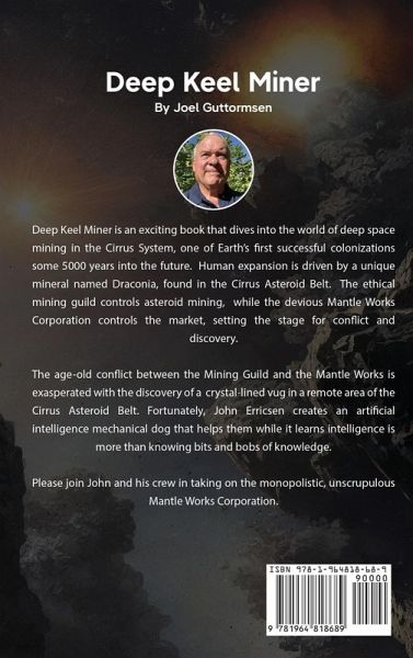 Deep Keel Miner is an exciting book that dives into the world of deep space mining in the Cirrus System, one of Earth's first successful colonizations some 5100 years into the future. Human expansion is driven by a unique mineral named Draconia, found in the Cirrus Asteroid Belt. The ethical mining guild controls asteroid mining, while the devious Mantle Works Corporation controls the market, setting the stage for conflict and discovery. The age-old conflict between the Mining Guild and the Mantle Works is exasperated with the discovery of a crystal-lined vug in a remote area of the Cirrus Asteroid Belt. Fortunately, a young man, John Erricsen, creates an artificial intelligence mechanical dog that helps them while it learns intelligence is more than knowing bits and bobs of knowledge. Please join John and his crew in taking on the monopolistic, unscrupulous Mantle Works
