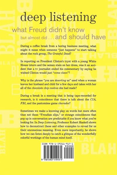 The keys to unlocking the real meaning behind what we say in personal and professional conversation. What do we really mean when we make embarrassing mistakes in conversation? Is there such a thing as inadvertent insult or a slip of the tongue? Exploring outside influences and the connections to our dream world, Dr. Robert Haskell guides us through the fascinating terrain of the unconscious, showing how our minds use feelings, sounds, and language to simultaneously hide and reveal what we secretly think and feel. Filled with intriguing and amusing illustrations from every day life, Deep Listening provides the key to unlocking the real feelings and meanings behind our interactions with family, friends, and co-workers.