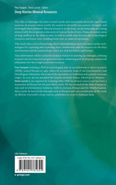 Yves Fouquet, holding a PhD in metallogeny and an accreditation to direct research (HDR), joined Ifremer in 1982, where he is currently head of the Geochemistry and Metallogeny laboratory. He is one of the specialists in hydrothermal systems on ocean ridges. In 2010, he was awarded the Grande médaille Prince Albert 1er de Monaco. Denis Lacroix is an engineer by training with a PhD in animal science and has been a researcher at Ifremer for the past thirty years. He has worked in the field of aquaculture and in international relations, both in overseas France and the Mediterranean. Since 2006, he has led the foresight unit at Ifremer and was coordinator of the study on Marine renewable energy sources, published in 2009 by Editions Quæ.