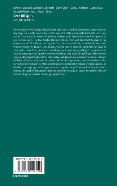 The demand for oil and gas has brought exploration and production to unprecedented depths of the world's oceans. Currently, over 50% of the oil from the Gulf of Mexico now comes from waters in excess of 1,500 meters (one mile) deep, where no oil was produced just 20 years ago. The Deepwater Horizon oil spill blowout did much to change the perception of oil spills as coming just from tanker accidents, train derailments, and pipeline ruptures. In fact, beginning with the Ixtoc 1 spill off Campeche, Mexico in 1979-1980, there have been a series of large spill events originating at the sea bottom and creating a myriad of new environmental and well control challenges. This volume explores the physics, chemistry, sub-surface oil deposition and environmental impacts of deep oil spills. Key lessons learned from the responses to previous deep spills, as well as unresolved scientific questions for additional research are highlighted, all of which are appropriate for governmental regulators, politicians, industry decision-makers, first responders, researchers and students wanting an incisive overview of issues surrounding deep-water oil and gas production.