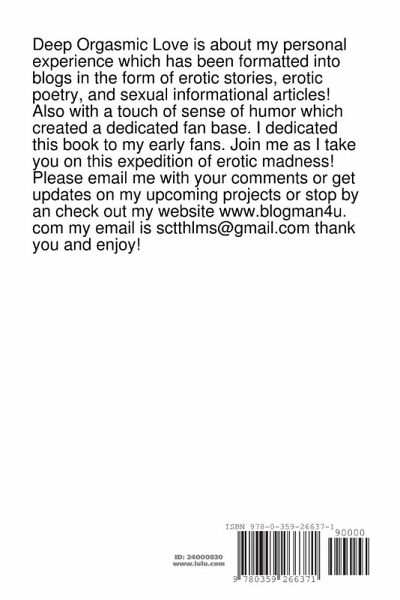 Deep Orgasmic Love is about my personal experience which has been formatted into blogs in the form of erotic stories, erotic poetry, and sexual informational articles! Also with a touch of sense of humor which created a dedicated fan base. I dedicated this book to my early fans. Join me as I take you on this expedition of erotic madness! Please email me with your comments or get updates on my upcoming projects or stop by an check out my website www.blogman4u.com my email is sctthlms@gmail.com thank you and enjoy!