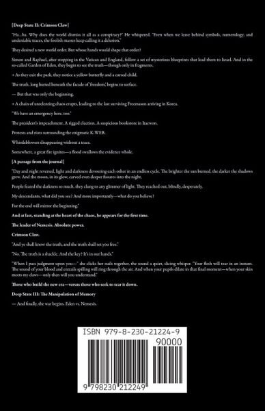 [Deep State II: Crimson Claw] "Ha...ha. Why does the world dismiss it all as a conspiracy?" He whispered. "Even when we leave behind symbols, numerology, and undeniable traces, the foolish masses keep calling it a delusion." They desired a new world order. But whose hands would shape that order? Simon and Raphael, after stopping in the Vatican and England, follow a set of mysterious blueprints that lead them to Israel. And in the so-called Garden of Eden, they begin to see the truth-though only in fragments. → As they exit the park, they notice a yellow butterfly and a cursed child. The truth, long buried beneath the facade of 'freedom, ' begins to surface. - But that was only the beginning. → A chain of unrelenting chaos erupts, leading to the last surviving Freemason arriving in Korea. "We have an emergency here, too." The president's impeachment. A rigged election. A suspicious bookstore in Itaewon. Protests and riots surrounding the enigmatic K-WEB. Whistleblowers disappearing without a trace. Somewhere, a great fire ignites-a flood swallows the evidence whole. A passage from the journal "Day and night reversed, light and darkness devouring each other in an endless cycle. The brighter the sun burned, the darker the shadows grew. And the moon, in its glow, carved even deeper fissures into the night. People feared the darkness so much, they clung to any glimmer of light. They reached out, blindly, desperately. My descendants, what did you see? And more importantly-what do you believe? For the end will mirror the beginning." And at last, standing at the heart of the chaos, he appears for the first time. The leader of Nemesis. Absolute power. Crimson Claw. "And ye shall know the truth, and the truth shall set you free." "No. The truth is a shackle. And the key? It's in our hands." "When I pass judgment upon you-" she clicks her nails together, the sound a quiet, slicing whisper. "Your flesh will tear in an instant. The sound of your blood and entrails spilling will ring through the air. And when your pupils dilate in that final moment-when your skin meets my claws-only then will you understand." Those who build the new era-versus those who seek to tear it down. Deep State II: Crimson Claw - Across the world, disasters strike in unison. And in the shadows, the Crimson Claw emerges. Deep State III: The Manipulation of Memory - And finally, the war begins. Eden vs. Nemesis. For centuries, they lurked in the dark. Now, they stand at the center of the world, staring down the barrel of each other's guns. Global chaos-disasters and terrorism escalating. Endless civil wars and resource conflicts consuming Africa. A Middle Eastern war igniting in Israel. China and Taiwan on the brink. A chain reaction that leads to World War III. The moment the nuclear launch sequence is triggered, the New World they longed for will be within reach.