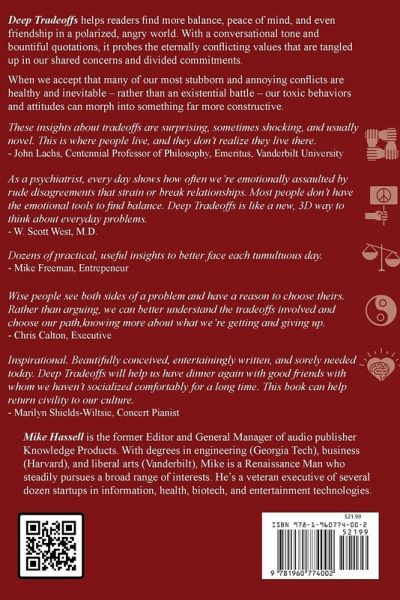 Deep Tradeoffs helps readers find more balance, peace of mind, and even friendship in a polarized, angry world. In just 200 pages of conversational, even-handed thoughtfulness, it probes the eternally conflicting values and truths tangled up in our shared concerns and divided commitments. More than 300 short quotes - from Samuel Adams and Aesop to Oscar Wilde and Stevie Wonder - illuminate the competing, intertwined perspectives of sages, philosophers, artists, professors, pundits, and ordinary people with extraordinary insights. By entering the conversation, you'll fortify or challenge your own ideas about belief, truth, knowledge, ideology, peace, the subconscious, and much more. Wise people see both sides of a problem and have a reason for choosing theirs. Rather than arguing, we can understand the tradeoffs involved and choose our path, with a fuller understanding of what we're getting and what we're giving up.