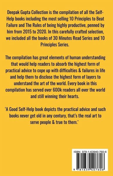Deepak Gupta Collection is the compilation of all the Self-Help books including the most selling 10 Principles to Beat Failure and The Rules of being highly productive, penned by him from 2015 to 2020. In this carefully crafted selection, we included all the books of 30 Minutes Read Series and 10 Principles Series. The compilation has great elements of human understanding that would help readers to absorb the highest form of practical advice to cope up with difficulties & failures in life and help them to disclose the highest form of layers to understand the art of the world. Every book in this compilation has served over 600k readers all over the world and still winning their hearts. ‘A Good Self-Help book depicts the practical advice and such books never get old in any century, that’s the real art to serve people & true to them.’