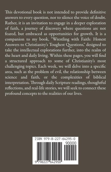 This devotional book is not intended to provide definitive answers to every question, nor to silence the voice of doubt. Rather, it is an invitation to engage in a deeper exploration of faith, a journey of discovery where questions are not feared, but embraced as opportunities for growth. It is a companion to my book, "Wrestling with Faith: Honest Answers to Christianity's Toughest Questions," designed to take the intellectual explorations further, into the realm of the heart and daily living. Within these pages, you will find a structured approach to some of Christianity's most challenging topics. Each week, we will delve into a specific area, such as the problem of evil, the relationship between science and faith, or the complexities of biblical interpretation. Through daily Scripture readings, thoughtful reflections, and real-life stories, we will seek to connect these profound concepts to the realities of our lives.