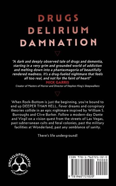 Drugs.Delirium.Damnation. When Rock-Bottom is just the beginning, you're bound to end up DEEPER THAN HELL. Fever dreams and conspiracy theories collide in an epic nightmare inspired by William S. Burroughs and Clive Barker. Follow a modern-day Dante and Virgil on a vision quest from the streets of Las Vegas, past subterranean cults and feral colonies, past the military facilities at Wonderland, past any semblance of sanity. There's life underground! "A richly imagined mashup of transgressive horror and visionary world-building." - Peter Atkins, author of Morningstar and screenwriter of Hellbound - Hellraiser II "A phantasmagoria of beautifully rendered madness." - Mick Garris, creator of Masters of Horror and director of Stephen King's Sleepwalkers