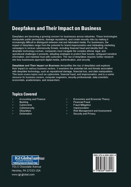 Deepfakes are becoming a growing concern for businesses across industries. These technologies manipulate public perceptions, damage reputations, and create security risks by making it increasingly difficult to distinguish between real and fabricated media. For businesses, the impact of deepfakes range from the potential for brand impersonation and misleading marketing campaigns to serious cybersecurity threats, including financial fraud and identity theft. As deepfake technology evolves, companies must navigate the complex ethical, legal, and operational challenges it presents, adopting strategies to protect their brands, safeguard sensitive information, and maintain trust with customers. The rise of deepfakes requires further research into how businesses approach digital media, authentication, and security. Deepfakes and Their Impact on Business demystifies the rise of deepfakes and explores their impact on various business sectors. It examines the potential risk and threats associated with deepfake technology, such as reputational damage, financial loss, and data manipulation. This book covers topics such as cybercrime, financial fraud, and impersonation, and is a useful resource for business owners, computer engineers, security professionals, data scientists, economists, academicians, and researchers.
