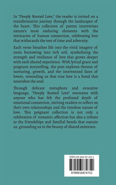 In "Deeply Rooted Love," the reader is invited on a transformative journey through the landscapes of the heart. This collection of poems intertwines nature's most enduring elements with the intricacies of human connection, celebrating love that withstands the test of time and adversity. Each verse breathes life into the vivid imagery of roots burrowing into rich soil, symbolizing the strength and resilience of love that grows deeper with each shared experience. With lyrical grace and poignant storytelling, the poet explores themes of nurturing, growth, and the intertwined fates of lovers, reminding us that true love is a bond that nourishes the soul. Through delicate metaphors and evocative language, "Deeply Rooted Love" resonates with anyone who has felt the profound depth of emotional connection, inviting readers to reflect on their own relationships and the timeless nature of love. This poignant collection is not only a celebration of romantic affection but also a tribute to the friendships and familial bonds that sustain us, grounding us in the beauty of shared existence.