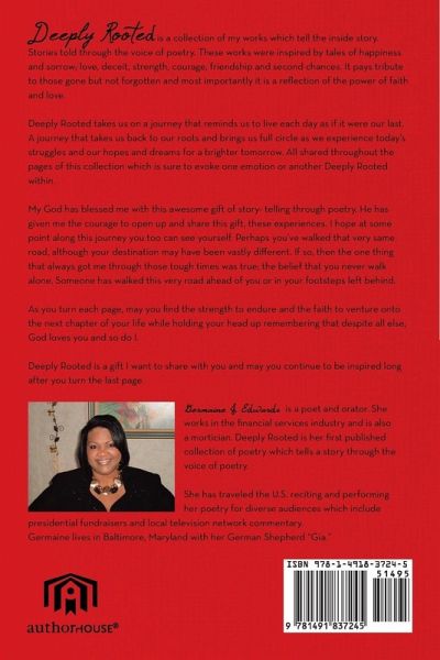 Deeply Rooted is a collection of my works which tell the inside story. Stories told through the voice of poetry. These works were inspired by tales of happiness and sorrow; love, deceit, strength, courage, friendship and second chances. It pays tribute to those gone but not forgotten and most importantly it is a reflection of the power of faith and love. Deeply Rooted takes us on a journey that reminds us to live each day as if it were our last. A journey that takes us back to our roots and brings us full circle as we experience today's struggles and our hopes and dreams for a brighter tomorrow. All shared throughout the pages of this collection which is sure to evoke one emotion or another Deeply Rooted within. My God has blessed me with this awesome gift of story- telling through poetry. He has given me the courage to open up and share this gift, these experiences. I hope at some point along this journey you too can see yourself. Perhaps you've walked that very same road, although your destination may have been vastly different. If so, then the one thing that always got me through those tough times was true; the belief that you never walk alone. Someone has walked this very road ahead of you or in your footsteps left behind. As you turn each page, may you find the strength to endure and the faith to venture onto the next chapter of your life while holding your head up remembering that despite all else, God loves you and so do I. Deeply Rooted is a gift I want to share with you and may you continue to be inspired long after you turn the last page.