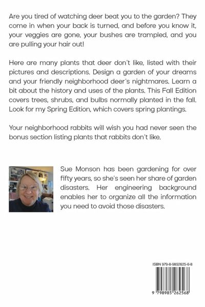 Are you tired of looking out your kitchen window and seeing Bambi eating your garden, acting like it's his own salad bar? Do they wreck what they don't eat, so your garden looks like a wreck? In this book, you will discover: Various methods to protect your garden from deer and rabbits Which plants deer find unappealing and why What plants are best for your soil type How much sun each plant requires When each plant blooms and what color the flowers are Which plants are susceptible to pests Height and width range of each plant How to plan your garden to make it unappetizing to deer but still beautiful and nutritious for you and your family This Fall Planting Edition covers trees, shrubs, and bulbs normally planted in the fall. For flowers, non-flowering shrubs, and herbs normally planted in the spring, see the companion book, Deer-Resistant Gardening in the Midwest; Spring Planting Edition. The friendly neighborhood deer will find your yard too much trouble or not very appetizing and decide to visit your neighbor's yard instead. So simple, even someone who has never had a garden before can do it! Special Bonus Section will list plants repellent to rabbits!