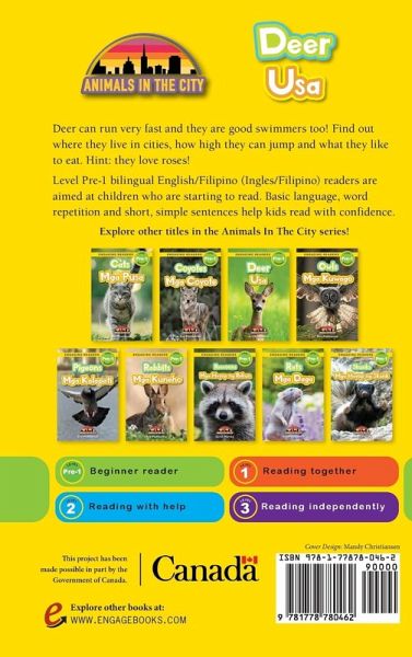 Deer can run very fast and they are good swimmers too! Find out where they live in cities, how high they can jump and what they like to eat. Hint: they love roses! Level Pre-1 bilingual English/Filipino (Ingles/Filipino) readers are aimed at children who are starting to read. Basic language, word repetition and short, simple sentences help kids read with confidence. This project has been made possible in part by the Government of Canada.