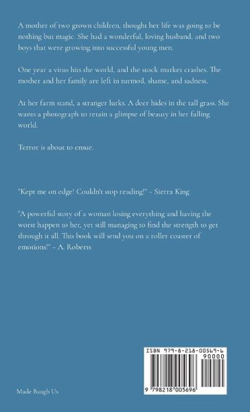 A mother of two grown children, thought her life was going to be nothing but magic. She had a wonderful, loving husband, and two boys that were growing into successful young men. One year a virus hits the world, and the stock market crashes. The mother and her family are left in turmoil, shame, and sadness. At her farm stand, a stranger lurks. A deer hides in the tall grass. She wants a photograph to retain a glimpse of beauty in her falling world. Terror is about to ensue. This is a thriller/romance/suspense fiction story written by a stay at home mother of four children with a love of reading and writing. This author's first book.